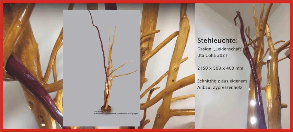 Stehleuchte zum Thema Fügungen, Titel „Leidenschaft“, Material: Schnittholz aus Privat, Entwurf und Herstellung_ Uta Golla